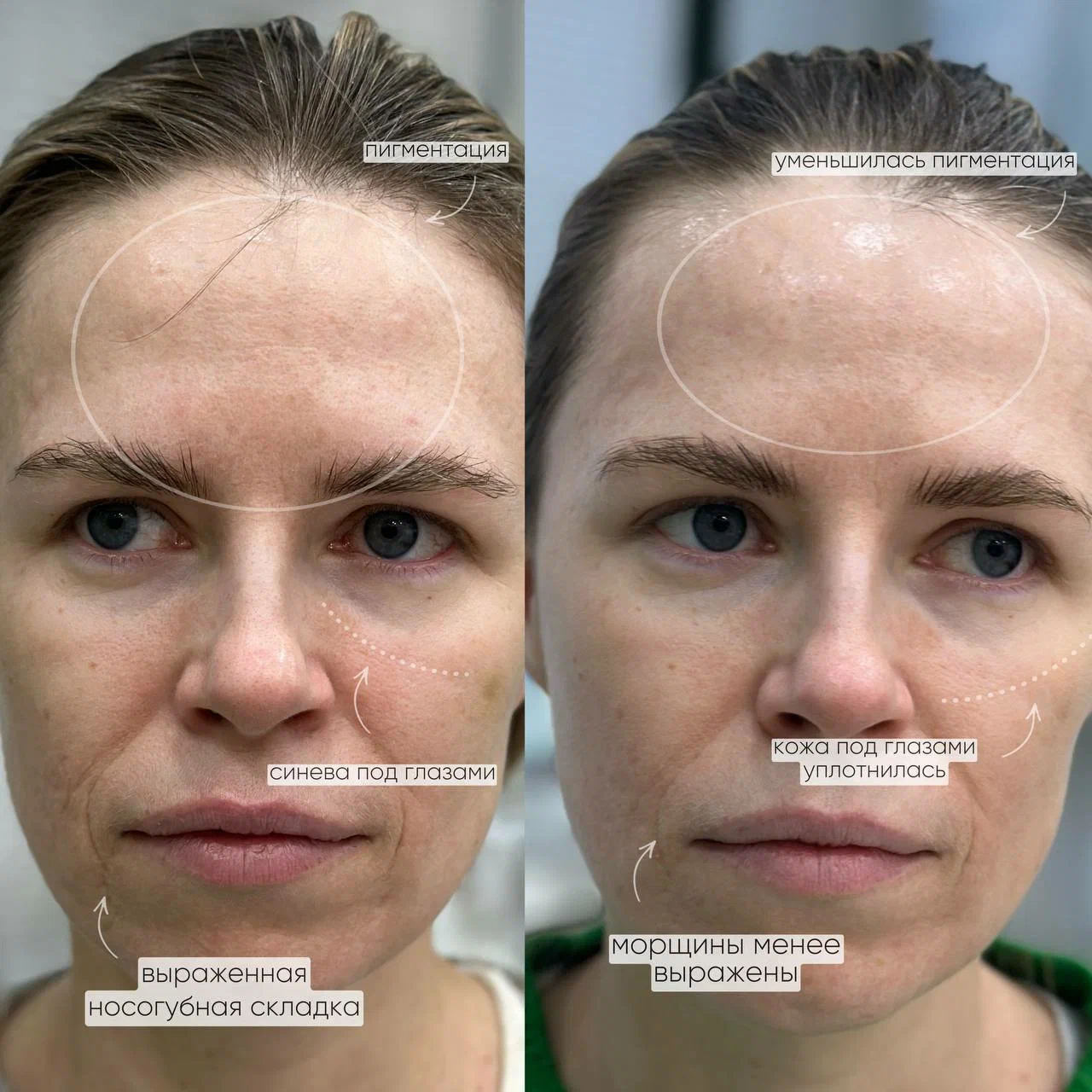 В первые часы возможна легкая эритема (покраснение) и отечность, которые бесследно проходят в течение 24-48 часов. Эффект обновления развивается поэтапно: первичное улучшение заметно через 7-10 дней, а основной курс неоколлагенеза длится от 3 до 6 месяцев, обеспечивая накопительный и пролонгированный результат.
